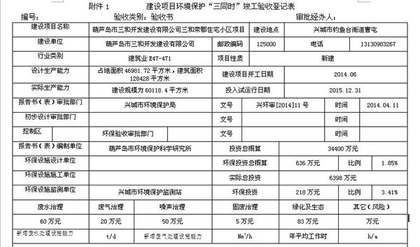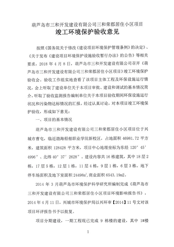 2014年3月葫蘆島市環(huán)境保護(hù)科學(xué)研究所編制完成《葫蘆島市三和開發(fā)建設(shè)有限公司三和榮郡居住小區(qū)項(xiàng)目環(huán)境影響報(bào)告書》,2014年4月11日,興城市環(huán)境保護(hù)局以興環(huán)審 【2014】11號文對該項(xiàng)目環(huán)評報(bào)告書予以批復(fù)。