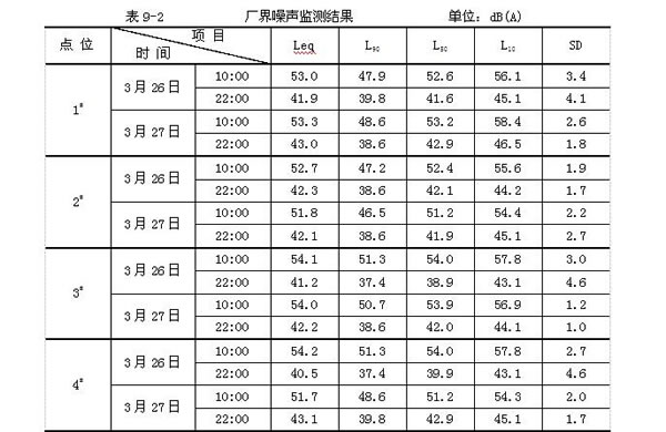 驗(yàn)收監(jiān)測期間,廠界四周晝、夜間噪聲監(jiān)測值均達(dá)到《社會(huì)生活環(huán)境噪聲排放標(biāo)準(zhǔn)》(GB22337-2008)1類區(qū)標(biāo)準(zhǔn)標(biāo)準(zhǔn)的排放限值,屬達(dá)標(biāo)排放。