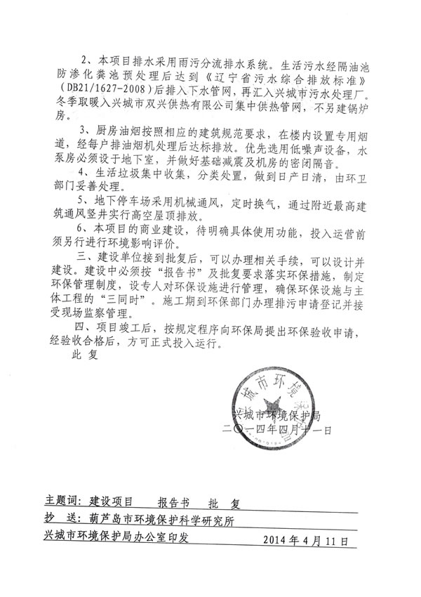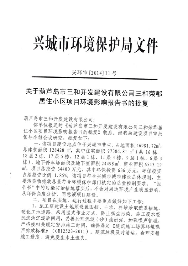 (13)興城市環(huán)境保護(hù)局 興環(huán)審【2014】11號文《關(guān)于葫蘆島市三和開發(fā)建設(shè)有限公司三和榮郡居住小區(qū)項(xiàng)目環(huán)境影響報(bào)告表的批復(fù)》,2014年4月11日;