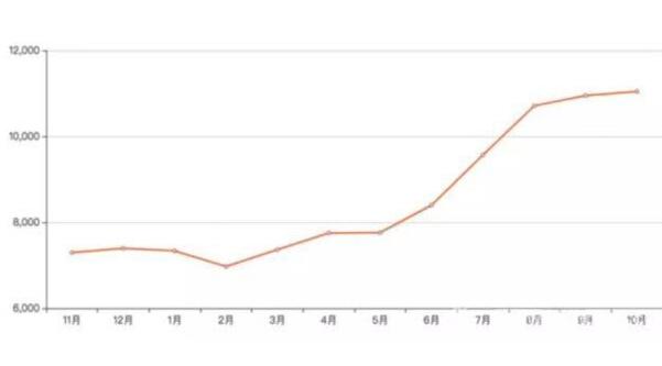 在多種因素的作用下,貴陽房價開啟狂奔模式。吉屋網(wǎng)的數(shù)據(jù)顯示,2018年10月,貴陽的新房均價為11172元/平方米,而去年同期僅為7377元/平方米,一年時間內(nèi)漲幅超過50%。