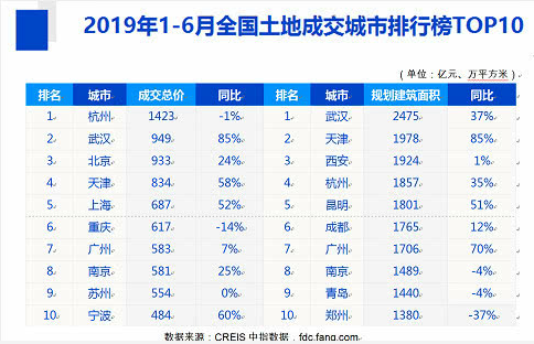 中指研究院發(fā)布的《2019年上半年全國房地產(chǎn)企業(yè)拿地排行榜》顯示,上半年全國土地成交金額TOP10城市(杭州、武漢、北京、天津、上海、重慶、廣州、南京、蘇州、寧波)累計(jì)成交7645億元,同比增長16%;規(guī)劃建筑面積TOP10城市成交17815萬平方米,同比增長9%。