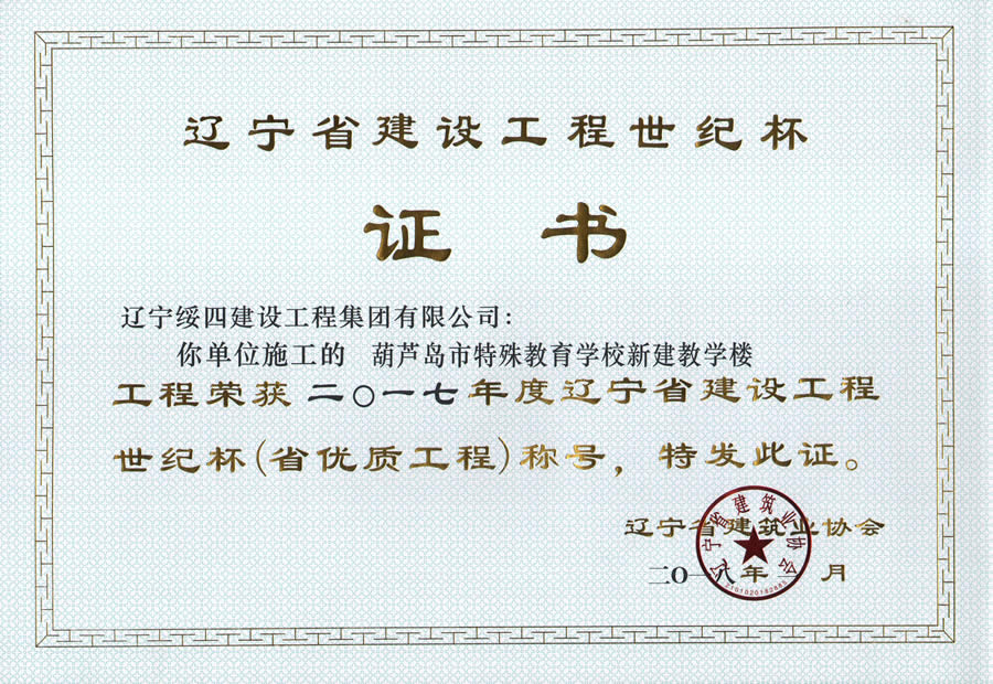 “葫蘆島市特殊教育學(xué)校新建教學(xué)樓工程”榮獲2017年度遼寧省建設(shè)工程世紀(jì)杯稱號