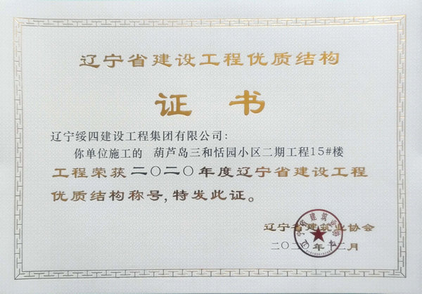 “葫蘆島三和恬園小區(qū)二期工程15#樓”榮獲2020年度遼寧省建設工程優(yōu)質(zhì)結構稱號