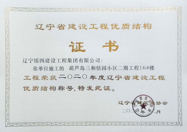 “葫蘆島三和恬園小區(qū)二期工程16#樓”榮獲2020年度遼寧省建設(shè)工程優(yōu)質(zhì)結(jié)構(gòu)稱號