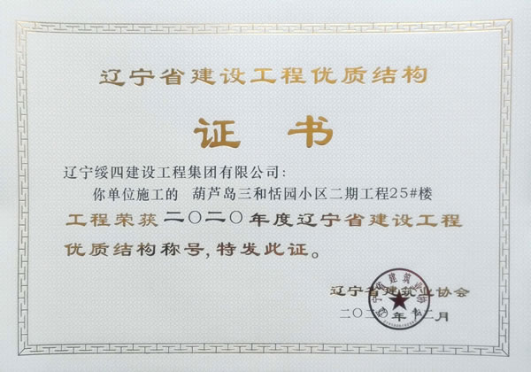 “葫蘆島三和恬園小區(qū)二期工程25#樓”榮獲2020年度遼寧省建設(shè)工程優(yōu)質(zhì)結(jié)構(gòu)稱(chēng)號(hào)